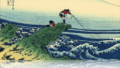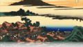 現在の長野県岡谷市、諏訪市、諏訪郡下諏訪町にまたがる湖を描いたもので、諏訪湖畔には、上諏訪・下諏訪その他の町が古くから発達していました。遠景に見える城は高島城です。諏訪湖越しに見る富士が藍の濃淡だけでつくられた藍摺(あいずり)によって美しく表現されています。諏訪湖にたった一艘だけ船が浮かんでいるのも、北斎の心憎い演出と言えます。遠近法を巧みに用いた構図も北斎独特のものです。