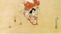 この美人の衣文にはフリヤ美術館蔵と似たところがあります。上に歌賛もなくて、大柄に一美人の行相の姿を写した、まさに堂々の感ある美人図であります。長春特有の美貌で、この人の場合は安度の項でいったような手指の過小さはなく、均衡のとれた姿となっています。またこの七三の角度からみた立像は、早く推古仏などにみられる形体美から脈絡する一種の伝統的な日本民族好みの相であるために、一見して得心できる美態であります。いちおう懐月堂の奥歯の筆さばきに近い描写であります。けれどもその筆様にはタフチがあり、色相の調和的構成も文様の造形効果も、長春には一日の長があることを、何人も直観するでしょう。