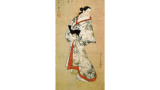 若者が着て来た着物を脱ぎすてて、浴衣にかえ湯殿にはいろうとするところ、女はその衣類をたたもうとして、袂の中から封じ文を探り出し、何か声をかけるので、男は艶冶なまなざしでふり返るといった場面の構図であります。あまり見かけない図柄でしょう。川又常行・常正らは京都の画家であろうと推定される人で、肉筆美人風俗画が比較的に多くのこっています。常行の方が線描が細麗であり、画題も豊富であるが、常正の作にはこうした美人図が多いようであり、線性格は様式化の傾向をみせています。技術的には常行に劣るうらみを感じさせるけれども、情緒的なとらえかたでは一段の風趣があって捨て難い。この絵はいかにも妾宅らしい小じんまりとした内奥での生活の一断面を写すものであって、製作年代は宝暦頃と見てよいでしょう。