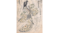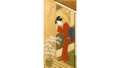 この版画は無落款であり、版元の標記もません。だが着衣の襟のところに「杉」「村」の二字を散らし、文様としていることから、杉村治兵衛正高の作であると考察される。かくし落款でしょう。昭和二十四、五年のころ芝の美術倶楽部での入札に、肉筆美人風俗図掛幅で、やはりこのようなかくし落款で椙村とある図をみた記憶があります。そのようなことが画家にとってどんな意義をもつのか了解に苦しむが、足利時代の水墨画にも先例があります。赤脚子のごときはその類でしょう。