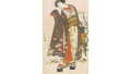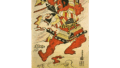 清倍落款の横大判の絵に「竹ぬきの図」があります。それは中央が竹に虎で、左が五郎、右は二十四孝の孟宗という竹にちなむ三図様のコンブリケイトしたもので、奇想をねらっての作出でしょう。その点、芸術的なものとは言えません。奥村政信も描き、またその他作例もある竹ぬき五郎で、最も優秀なのは初代清倍の描く大々判丹絵のこの図であります。若井兼三郎氏の扱いで海外に出たものが、ペペール・コレタションから松方、さらに東京国立博物館の保管となっているこの一作は、「象引」や「暫」と同様に今のところ他には伝わらないようであります。本紙は多少くすみすぎてはいますが、鮮かに全身丹の彩色となっており、清倍独往の誇張描線で三升の定紋うった衣の双肌ぬぎ、怪力無双の竹抜きであります。鳥居流の瓢箪足、力こぶ隆々とした双腕、むき出た眼晴、こうした手法は清倍の開発でしょう。熊笹と笥の貧相さは、画者がちがうかと思われるほどに奇態であります。