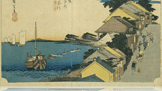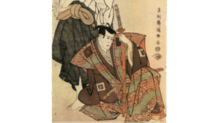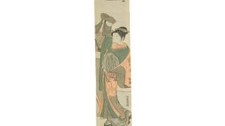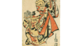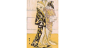 シカゴ美術館の「初期浮世絵展カタログ」には、「市河団十郎、あらし喜世三郎、定家生嶋新五郎の道行図」(あぶら丁七郎兵衛板)がのせてあります。それとはなはだ近いのが版元名を欠くこの図で、「ていか公」「大江さへもん」「のわけ」と書き込みがあり、背景には「せみ丸わらやのとこ」「ひゑいさん」「坂本さんわう」「しかから崎一つ松」など注記した名所を描いています。吉田暎二氏は「宝永七年(1710)十一月山村座の「神力定家東遊」を描いた作と見られる」とし、野分は坂田荻之丞の役だとされる。それには詳細な考証が付記されています。「しかしこの絵には役者名も役者の紋章も記されていないから役者絵ではないといえるかもしれない」とも言うています。「ていかの道行」とて江戸四民の間に伝承した物語を描いたもの、署名がなく、年代や作品から初代清倍に帰せられてはいますが、筆線にはやや異質的なところもあり、断定は困難でしょう。