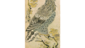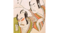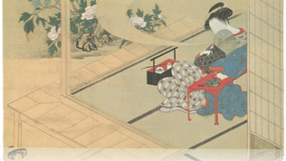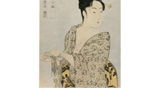 放生を描くものでもあろうか。鳥かごのふたをあけたものを捧げもち、美人は小敵を指先につまんで、いま放そうとしているようであります。