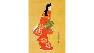 鳥居清倍と署名しています。初代清倍独特な肥痩強弱・遅速筆圧などいう毛筆の働きを強調した描写で衣文の描出をまとめています。それは写実には程遠い観念的な様式ではあるが、そのような誇張が苦にならず別に何とも思わないのは、毛筆に親しんできた日本人の通性と言うものでしょう。線による形態の描出は、もともと客観界には存在しないことであります。したがりてそれはきわめて主観的な意想の描出に外ならません。このような絵には衣裳図文も細麗な花文などは避けられ、印象的な丹彩がマッチするわけであります。それにしても容貌や手足が何と細い線でしょう。いささか貧困にすぎる表現ではあるまいか。