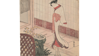 秋草の露をふくんで繁りあう(武蔵)野を、相愛の若い男女がむつみあう図様で、清広の大々判紅摺絵を代表する著名な遺作であります。