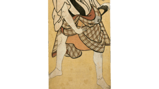 山川白酒の樽を左隅に添え、半格子の窓をバックに、中央に仲蔵の意休、五代団十郎の助六をはさんで左に宗十郎の白酒売、右に松助の門兵衛をはさんで里好の揚巻太夫という勢揃い、細判五枚梗きの完結した遺例です。この「三浦屋店先の場」もまた、江戸っ子の血を沸かせ肉おどらせた当たり芸の一つでした。このうち中村里好はもと松江といい、安永二年俳名里好を転用して役者名につかいましたが、天明六年に四十五歳で没しています。春章は好んで彼を描きました。
