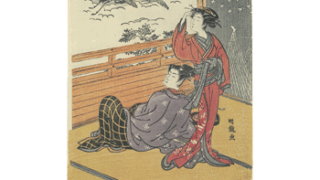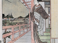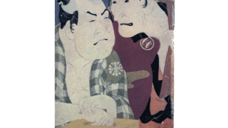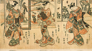 春章の作には市川団十郎、中村松江、岩井半四郎、市川門之助、瀬川菊之丞、松本幸四郎、中村仲蔵、大谷広右衛門などの半身像をうつすものがあり、ほかに豊春の魚、湖竜斎の花扇や梅に尾長鳥などが残っています。清長の竪二枚続き大判錦絵に扇の地紙充りを描いてあるように、岩戸屋の敬白の通り実用に徹したり、また足利時代からの慣習の扇散らしの屏風などに貼装したと思われます。