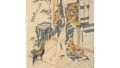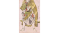 雪を帯ぶ老梅、暗冥な空あいの雪片、積もる雪原と、かなり写生的な背景のしずんだムードの中に鮮かに描き出された衣裳、糸にのったロマンチッタなリズムの一瞬に、三人の姿と表情、目くばりのつくりなす劇感情を見事に表現した、完好の遺品です。