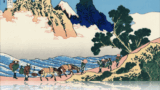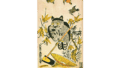 栞形の題簑に「おし輪形」と題し、娘道成寺、吉原雀、葛の葉、枕獅子、布晒、それにこの春駒などの所作事を大判錦絵に作っています。春英の新工夫であったらしいです。まねごとのはやった浮世絵界で、これには類作が出なかったのをみますと、あまり評判にもならなかったというのか、春英の独り芸におわってしまったようです。押し絵(貼り絵)といって人物などを布地で作り羽子板などに貼装して、半肉彫風の写実味を出したものからのヒントで描いたのでもありましょうか。寛政中の作と思われます。