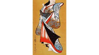 三十六花撰と洒落て、王朝の和歌・三十六歌仙を略しました。これも春信らの古典時様化で強くうち出された発想法で、遊里はまさに江戸町人にとっての玉楼の寝殿造り、遊女は光源氏が愛した大宮うちの女たちになぞらえもしました。うつせみの哀れと観ずれば、馳染のやさ男と袖にしのんでかたく結ばれ、女の館を添うていま立ち出でようとするに、青簾の奥からなんぞ声あってかえりみる……情緒纏綿です。衣文の流れるような暢びた線、棒縞こまかにたゆとう裳すその乱れ、恋情さらにたえ難くします。