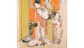 重政はすでに宝暦のころから作画にはいりました。須く原屋茂兵衛と称する書肆に生まれ、幼にして絵を好みましたので、紅摺絵など版行する機会も早く訪れたにちがいありません。明和の錦絵作興に力をつくし、安永・天明に大成しましたが、春章・豊春と合作し、湖竜斎ともよく、錦絵開創の支柱でした。絵本挿絵にも意を注ぎ数種の名作ある中で「青楼美人合姿鏡」(春章と合作)は最もすぐれ、安永五年の刊で、輩俯の相互彫響から自我を打ち出そうとしています。天明期にはいると彼独自の佳境をひらき、北尾流の特色を歴然と輝かし、門下の政演・政美また師を擁して浮世絵黄金時代を睨んだ。
