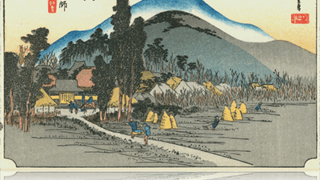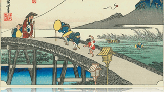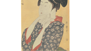シリーズ名は柱形に「東西南北之美人」となっていて、北は「北廊よし原」、南は「品川」、西駅は「内藤新宿」、これを当時名だたる四岡場所とよび、あるいは悪所でもありたわけで、ここには多くの美女佳人の城が幾棟いらかをきそっていました。深川は羽織芸者などと呼ばれて最も江戸の風土になじんだ粋な芸者が、江戸情緒を謳いあげていました。この絵は天明期の作、重政の代表美人画ですが、その四年には未曾有の飢饉に見舞われ、とくに東北地方が苛酷で、家のため親のために犠牲となり、人買いに連れ去られて吉原に身を沈める、聞くも哀れな小娘たちが見られました。政治貧困がなせる江戸の繁栄でもあったのです。