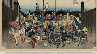 この絵にも左のはじに一行に書き入れがあります。それは「安永五申年春の末夏の初メ しゆすぴろうどの錦画…………此頃此地の風情……」。安永五年の夏ちかく、この地、つまり東方・深川の仲町あたりで、しゅすやぴろうどを着用するのが流行で、錦絵に写されているといった文意のようです。