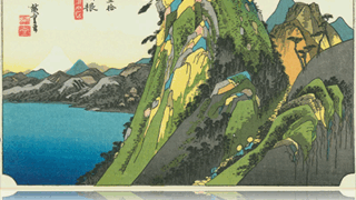 広重は十五歳のころに歌川豊広に入門するがその名が知れるようになるのは、それよりずっとのち、広重三十五歳のときに発表した「東都名所」(図44・45)の成功があってからです。そして翌々年の天保四年(1833)からはじまる「東海道五拾三次」(図46~49)シリーズにいたって、その名声はゆるぎのないものとなりました。